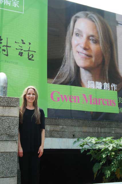 Marcus on campus next to a poster announcing her lectures